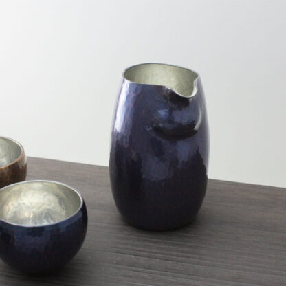 表面装飾は、伝統技法によって銅を青藍色に発色させています。また銅は使用経年により錆色を変え、渋みと趣きのある色へと変化していきますので、月日と共に変わっていく酒器の表情もお楽しみください。(完成時の表面には焼付ラッカーコーティングを施してあります。有償で錆色修繕も承ります。)